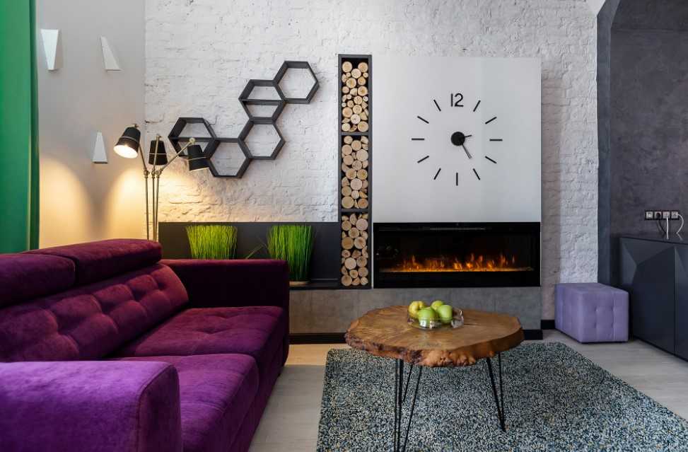 Подобное решение позволит сгладить нотки агрессивности фиолетового, в результате чего гостиная наполнится спокойствием. Это может быть тандем насыщенного фиолетового с лаконичным светло серым либо, наоборот, сочетание оттенка мокрого асфальта с бледным фиолетовым. Главное не создавать ощущение размытости границ между используемыми тонами. В противном случае серая гамма возьмёт верх, а гостиная потеряет привлекательность.
