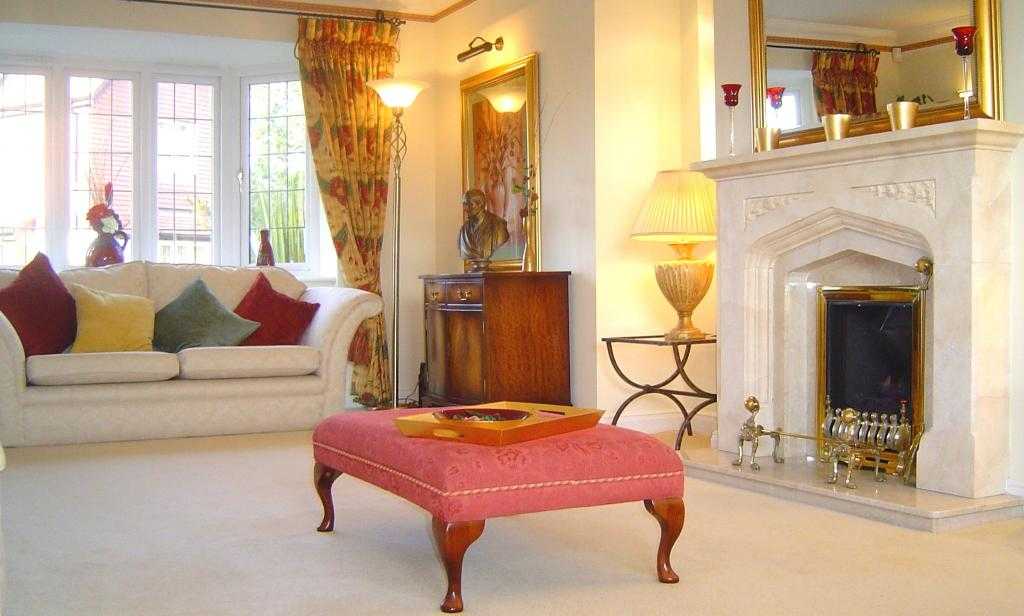В классических гостиных уместно большое количество декора. Это картины, статуэтки, подсвечники, ковры, вазы, красивые часы, зеркала в дорогих рамах. Для обивки мебели или отделки стен могут использоваться орнаменты. Чаще всего это растительные узоры и полоска. В классическом стиле интерьера в эркере гостиной уместен камин с парой кресел рядом.
