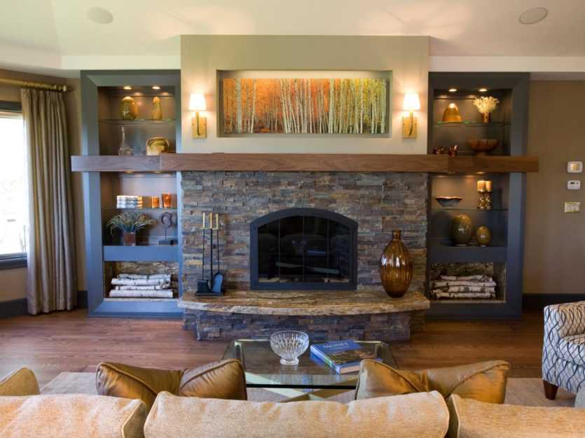 Третий прием заключается в создании тематической приставки с открытыми полками, где можно расставлять вазы, светильники, статуэтки и другие аксессуары. Но ниша может быть и большой, если она создается под камин.