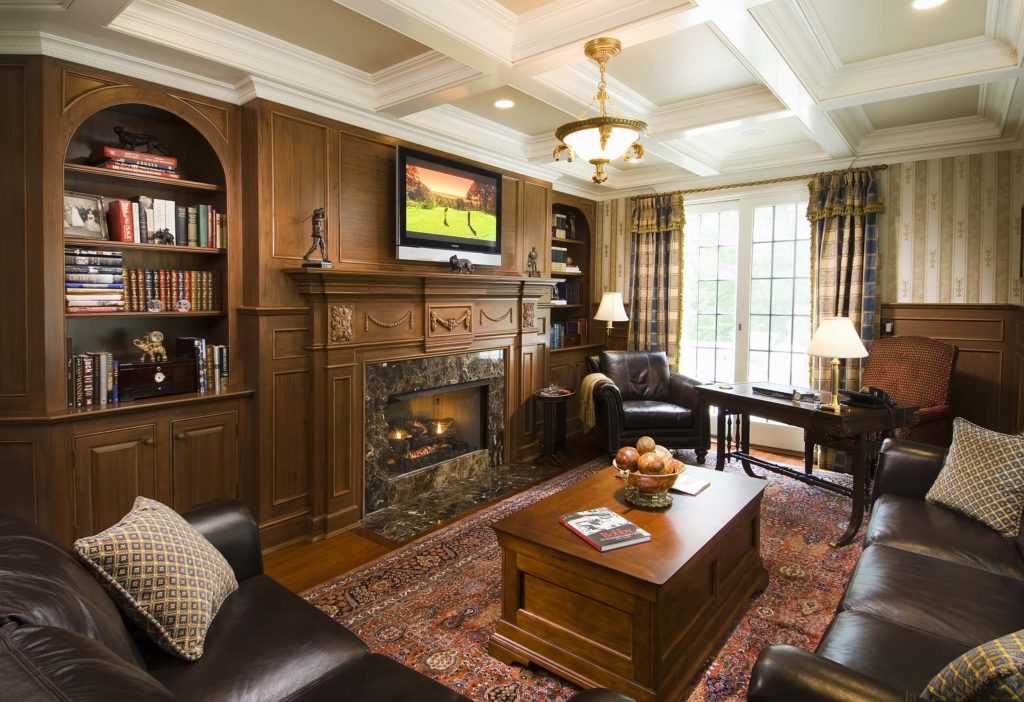 Практически в каждом зале в таком дизайне стоит библиотека, хотя в большом доме она может быть расположена и в отдельной комнате. Удобно при этом сделать помещение частью гостиной, отделив, например, раздвижными дверями, которые при необходимости обеспечат уединение и уют.