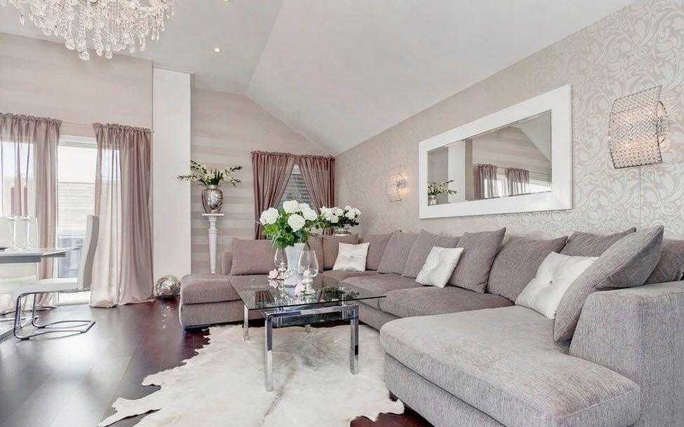 Нежно-серый – это благородный и строгий цвет, который в последнее время широко применяется для дизайна гостиных комнат.