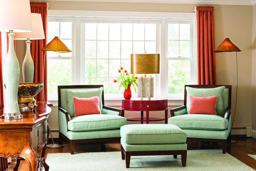 Дома с эркерами позволяют создавать оригинальные дизайнерские решения. А в классическом интерьере эркер можно использовать для оборудования тихого уголка с диваном или поставить в нем пару кресел и кофейный столик. Если эркер не глухой и выходит в сад, то занавески делают полупрозрачными или используют римские шторы.