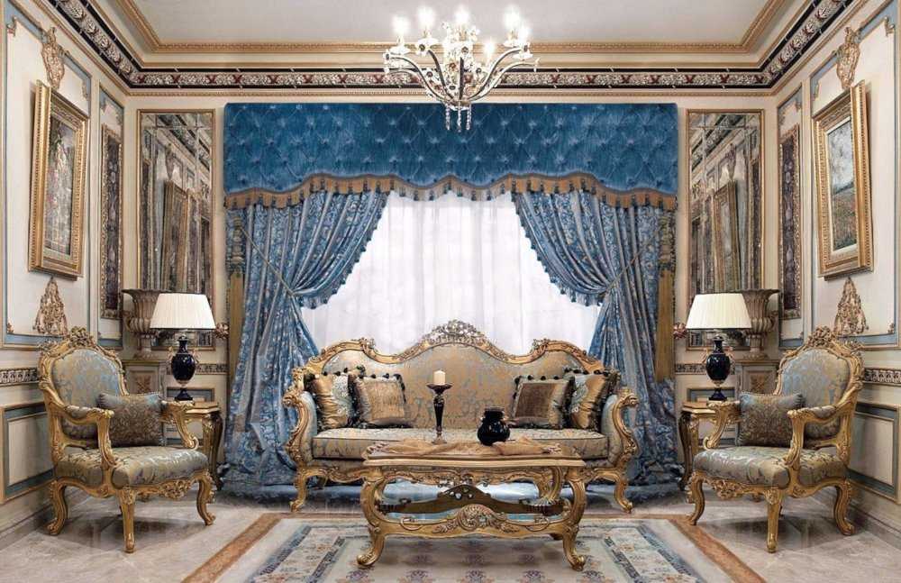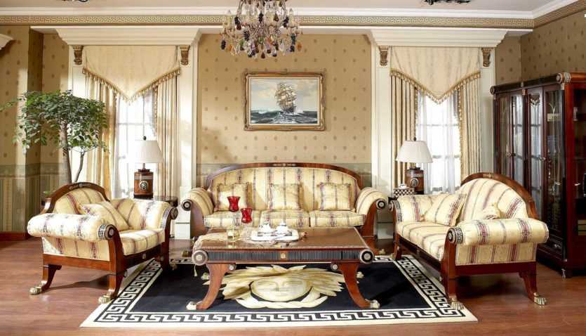 Обязательны диван и кресла, обитые богатыми тканями. Также можно подобрать кушетку-канапе, комод, небольшой столик и несколько пуфиков.