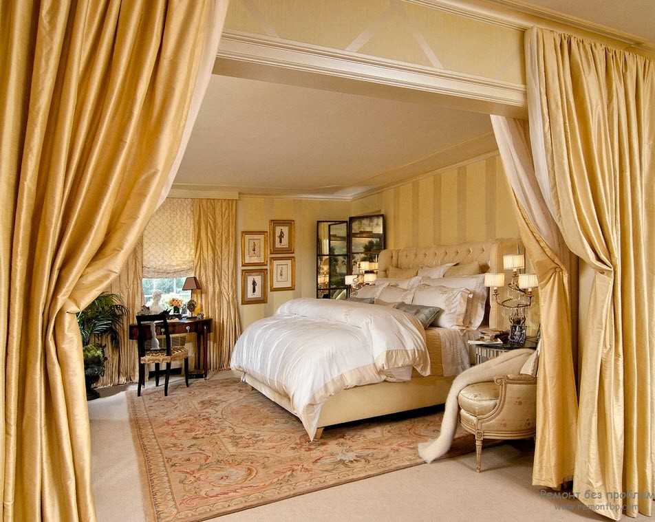 Дизайн спальни в стиле барокко оформить не составит особого труда. Основной акцент на кровати — важном элементе в дворцовом интерьере. Она обязательно массивна, с роскошным изголовьем, наличием полога и различных драпировок