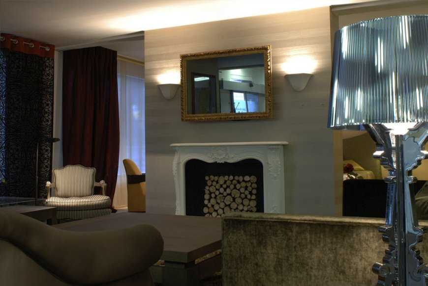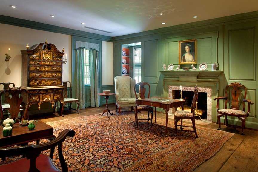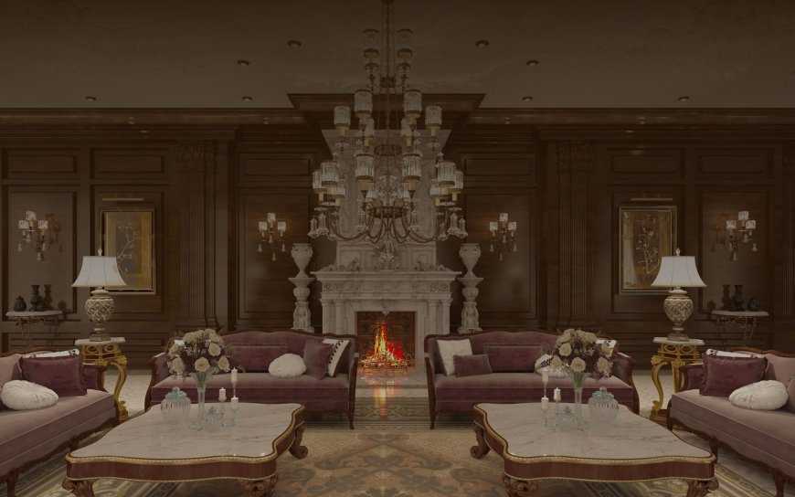 Дизайн даже маленькой комнаты для гостей подразумевает использование больших каминов с нестандартной отделкой, отборного текстиля. Приветствуется употребление ценной древесины. Тональности подбирают с расчетом на подчеркивание глубины пространства и формирование контраста. Специалисты советуют отдавать предпочтение бордовым, зеленым, черным и белым расцветкам. При ремонте стены, дверные и оконные рамы часто инкрустируют, также можно применять штукатурку с включениями лепнины и имитировать колонны.