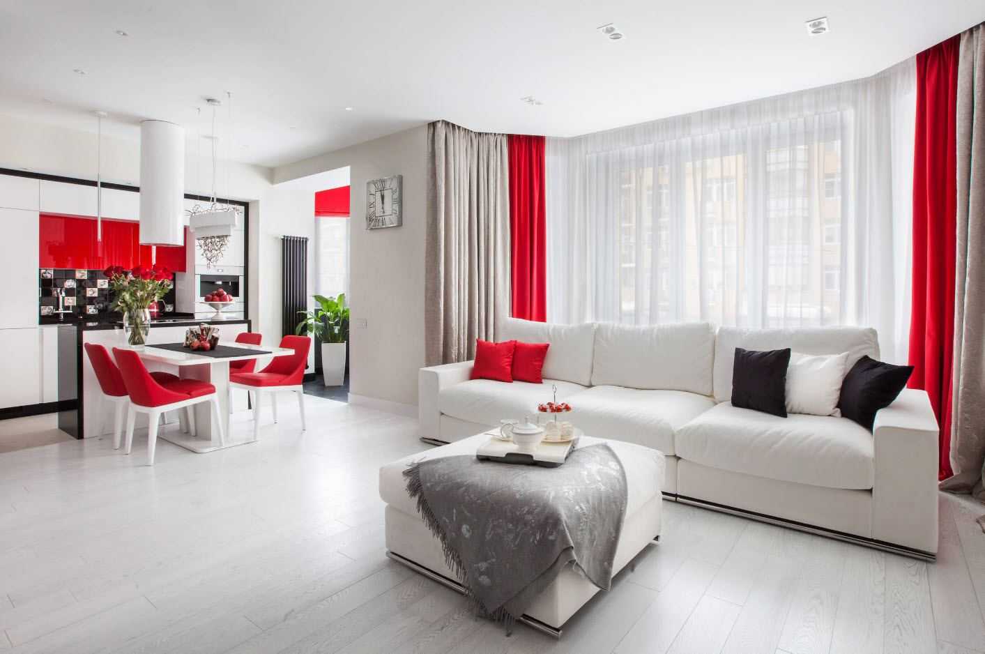 - Белый цвет обладает универсальностью в плане моды. Он считается классикой, поэтому вы на протяжении долгих лет можете любоваться своим залом и всегда соответствовать модным тенденциям.