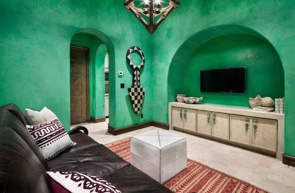 Создавая гостиную с восточным акцентом, лучше всего использовать оливковый или нефрит. При создании средиземноморского стиля подойдет оттенок морской глади или другой светло-зеленый оттенок.