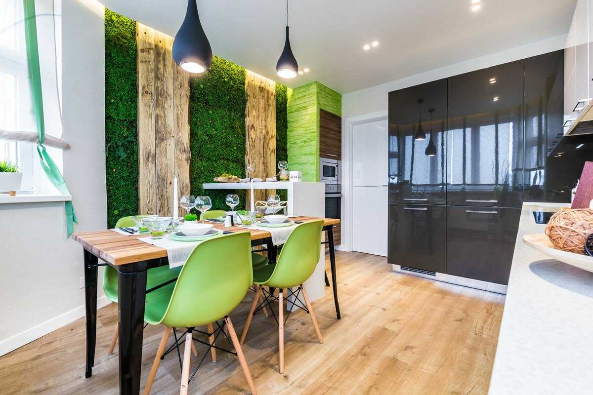 При оформлении кухни выбирайте прочный отделочный материал для стен. Обои на основе флизилина или винила легко поддаются чистке и выдерживают влагу. Более практично использовать керамическую плитку.
