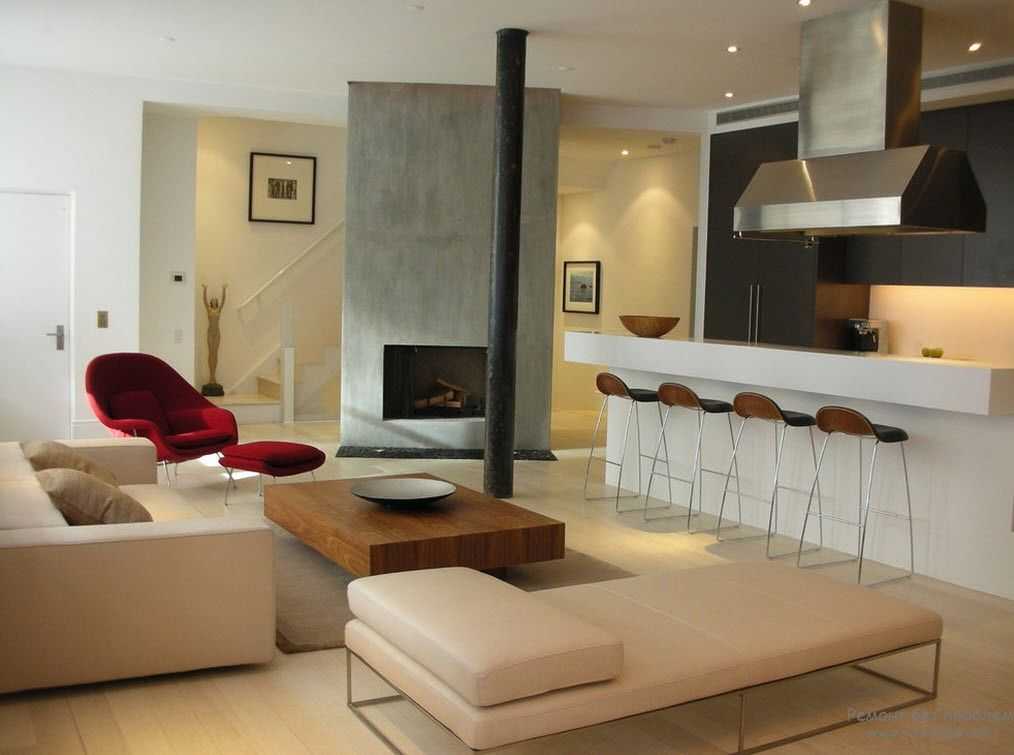 Для зала чаще всего применяют более практичные и не слишком миниатюрные конструкции, с размещением рядом с диваном или креслами. Кроме того, с помощью узкой длинной модели, можно визуально зонировать пространство в студии или кухне-гостиной.