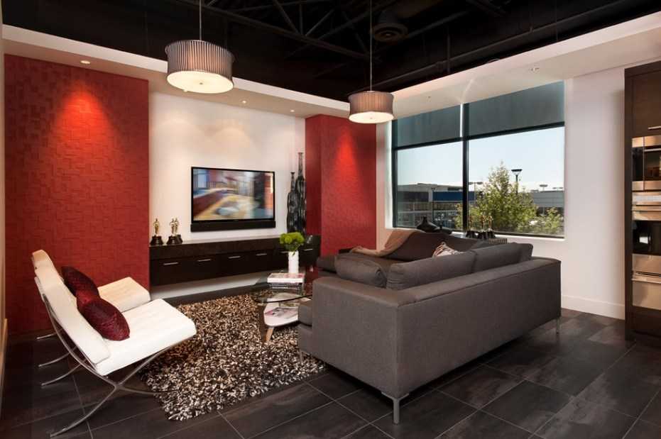 Также популярным решением стало сочетание красного и черного цвета. Конечно же, такой вариант весьма активный, но в этом и заключается его привлекательность. В данном случае стоит использовать черный цвет в небольшом количестве, чтобы не сделать гостиную излишне темной и мрачной.