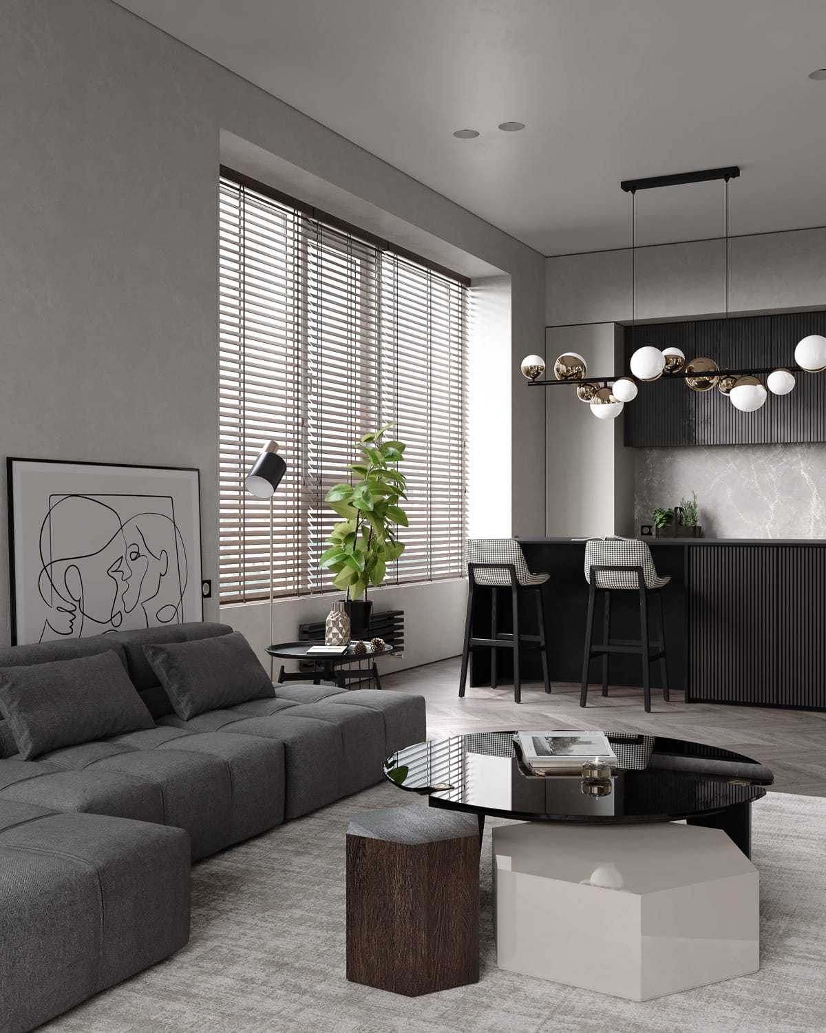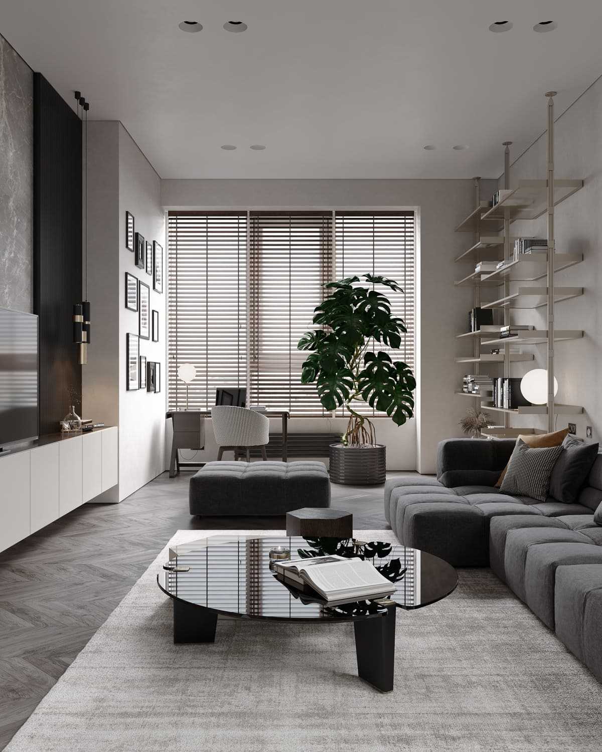 Серые и черные тона в дизайне гостиной, в гармоничном сочетании с белым цветом, всегда будут популярными и актуальными. Серый и черный цвет подчеркнут элегантность внутреннего убранства комнаты, выгодно создадут нейтральную площадку для размещения самых разных акцентов, а там дело за вашим вкусом и предпочтениями.