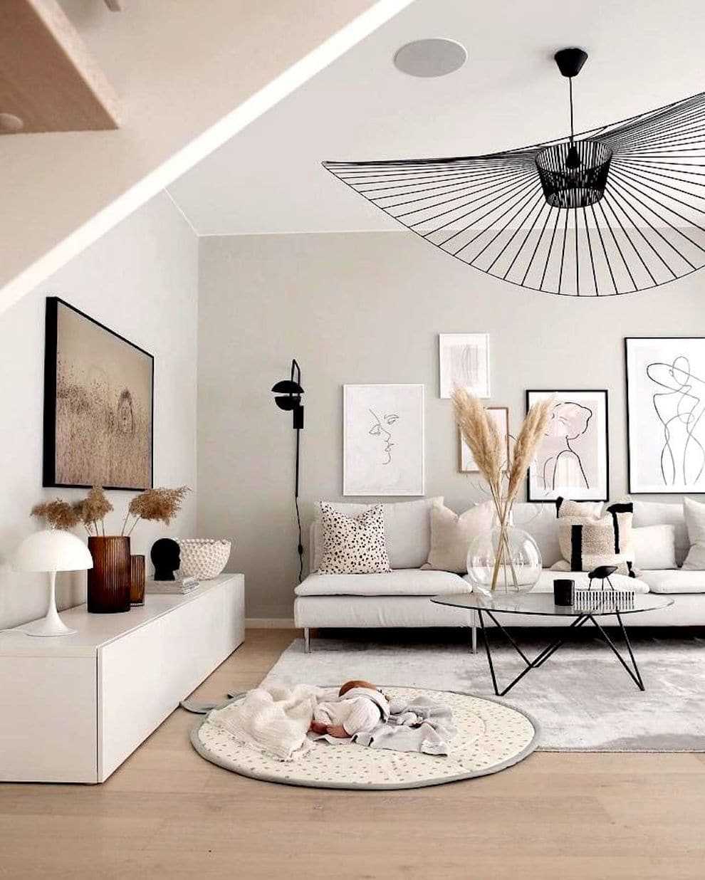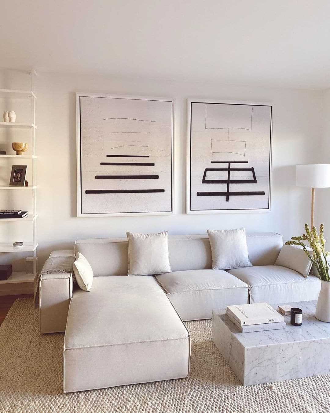 Картина, висящая на стене интерьера гостиной в стиле минимализм, должна быть современной и цепляющей взгляд Источник sdesign-homes.ru
