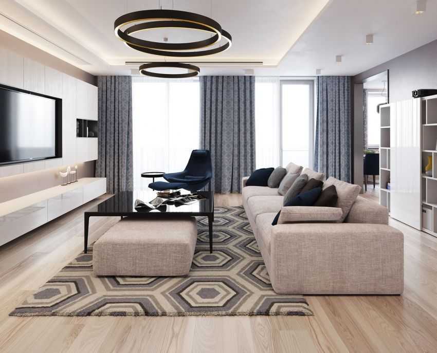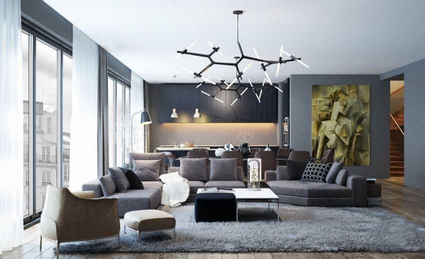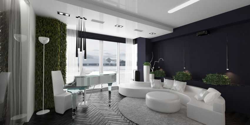 В стиле хай-тек или минимализм в декоре гостиной, обивке фасадов мебели или отделке стен станут прекрасным выбором: темно-синий, приглушенный темно-зеленый, асфальтово-серый или черный цвета. Данные оттенки превосходно сочетаются с глянцевыми поверхностями или металлическим холодным блеском некоторых деталей.
