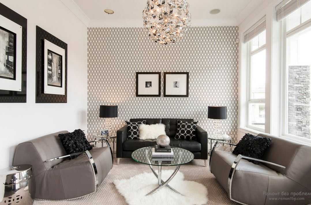 Используя всего лишь черно-белую расцветку можно создать очень стильный интерьер. В гостиной с темными однотонными обоями идеальным украшением будут черно-белые фотографии или же наоборот – цветные броские пятна. Светодиодное освещение в современном дизайне будет выглядеть особенно эффектно.