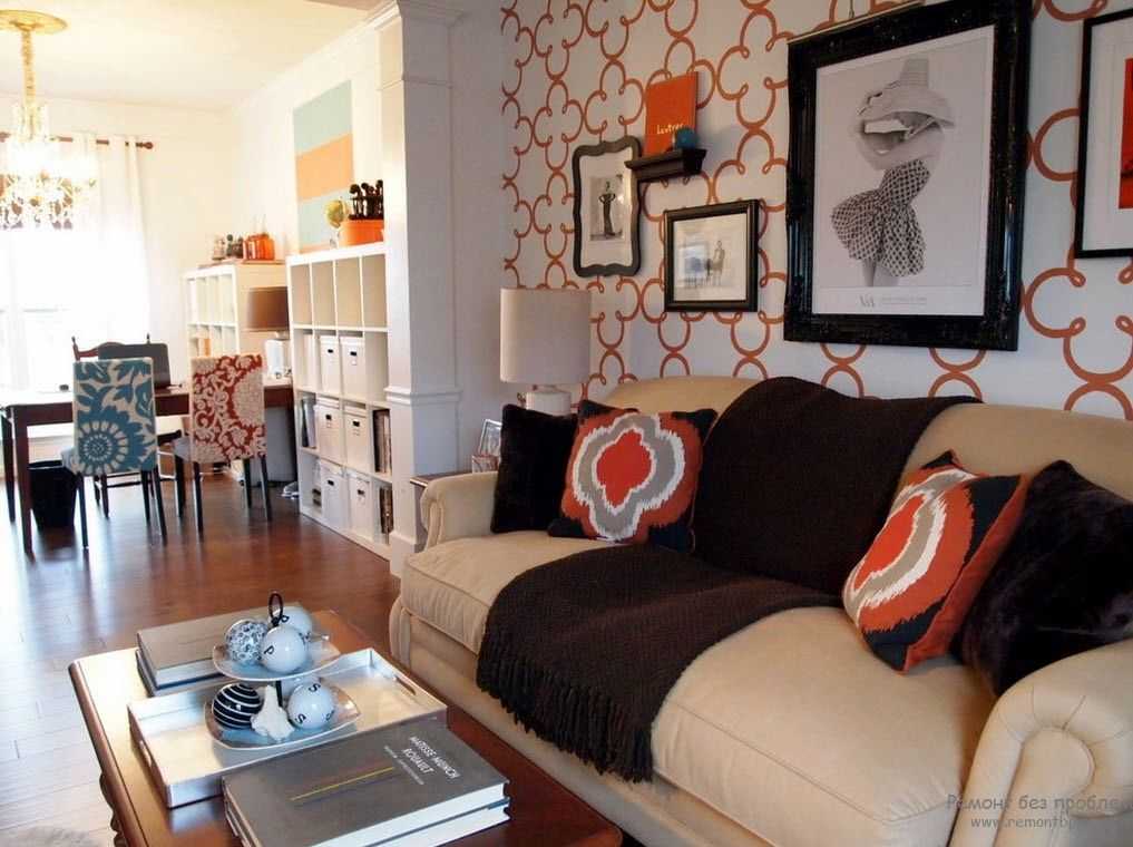 Красный узор на обоях также наполнит гостиную желаемым уютом