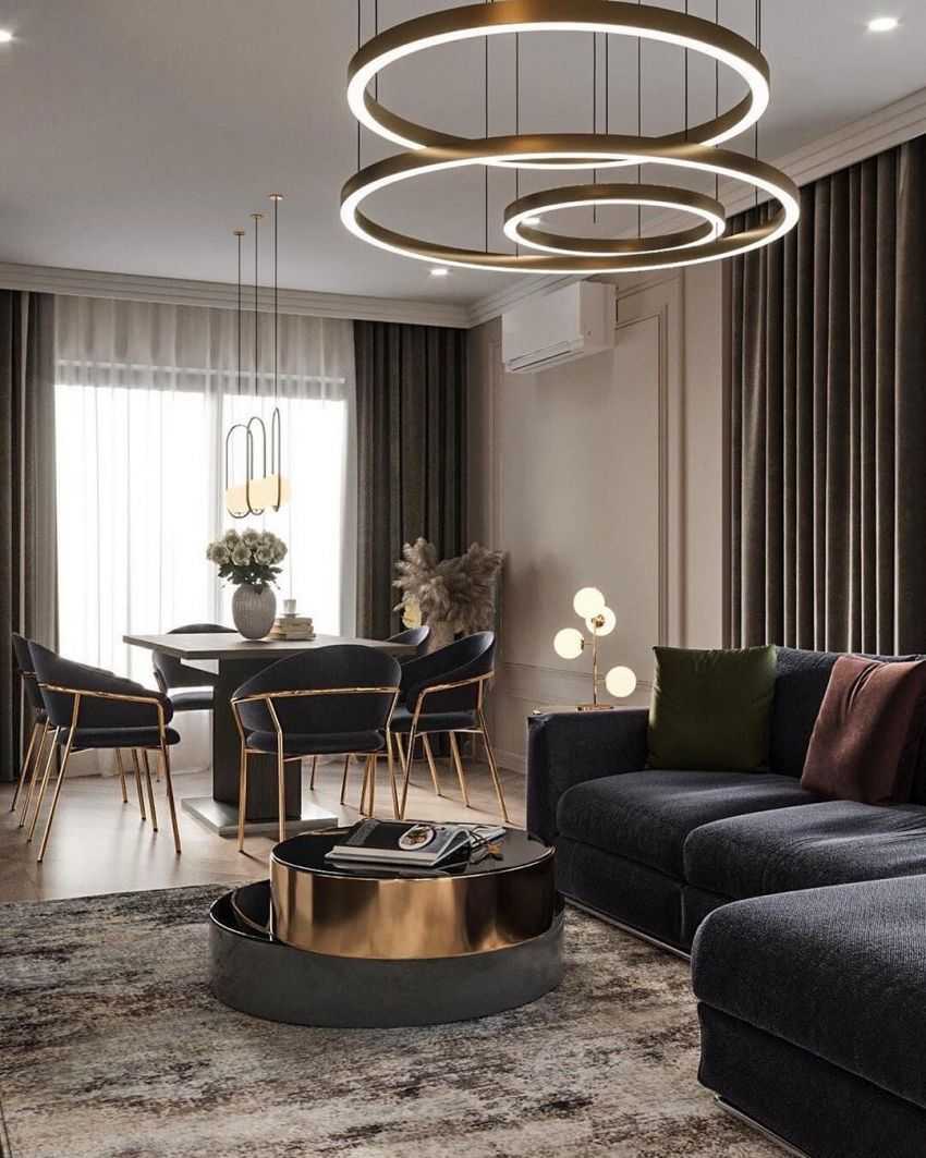Роскошные люстры с хрустальными подвесками, ткани с металлизированными нитями, позолота выигрышно смотрятся на темном фоне мебели и обоев. Большие зеркала, обрамлённые красивыми рамами, добавят гостиной света, тем самым увеличив объём комнаты. Гостиные, выполненные в этом стиле, невзирая на темную гамму, выглядят душевными и комфортными.