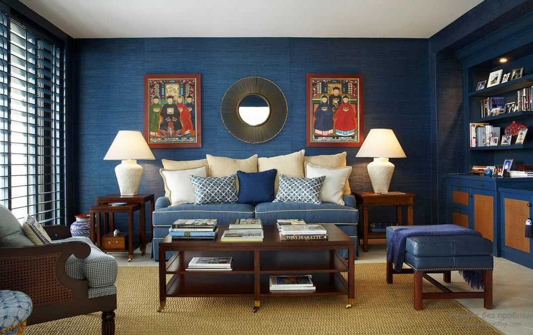 Находиться в такой гостиной приятно уже потому, что такая атмосфера бодрит и наполняет нас энергией. Но вместе с этим синий очень спокойный цвет, он помогает расслабиться, успокоиться и отдаться своим мыслям и фантазиям. Но так, как сам по себе этот цвет слишком холодный, рекомендуется разбавлять его белым, возможно, в виде нескольких акцентов.