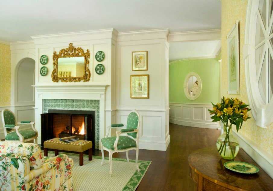 Как мы уже говорили, для создания полной гармонии, основной зелёный цвет в дизайне гостиной следует непременно дополнять и разбавлять другими цветами, и наиболее приемлемыми вариациями в этом случае можно назвать классический белый, серый, жёлтый, синий, бежевый либо коричневый. При этом сопутствующие оттенки могут быть использованы во всех своих проявлениях.