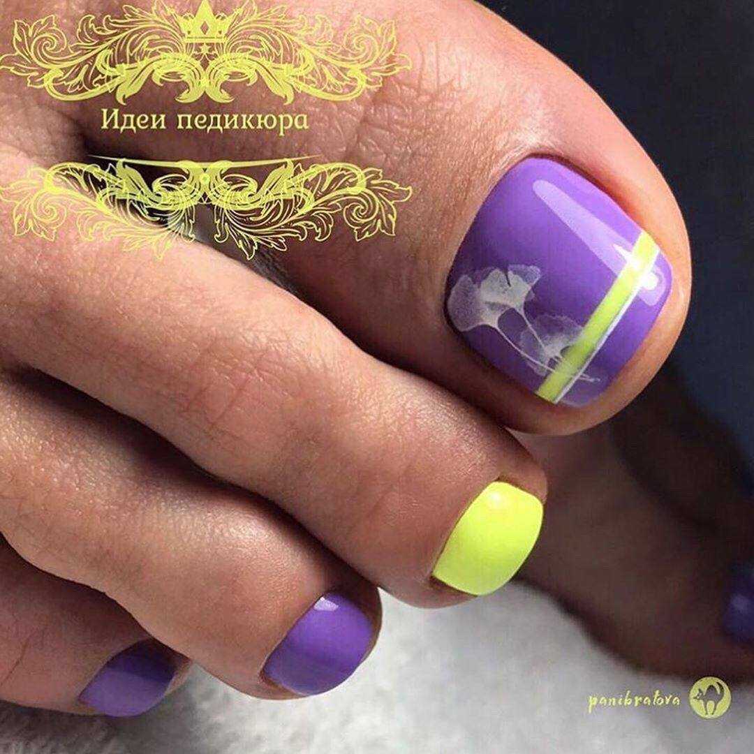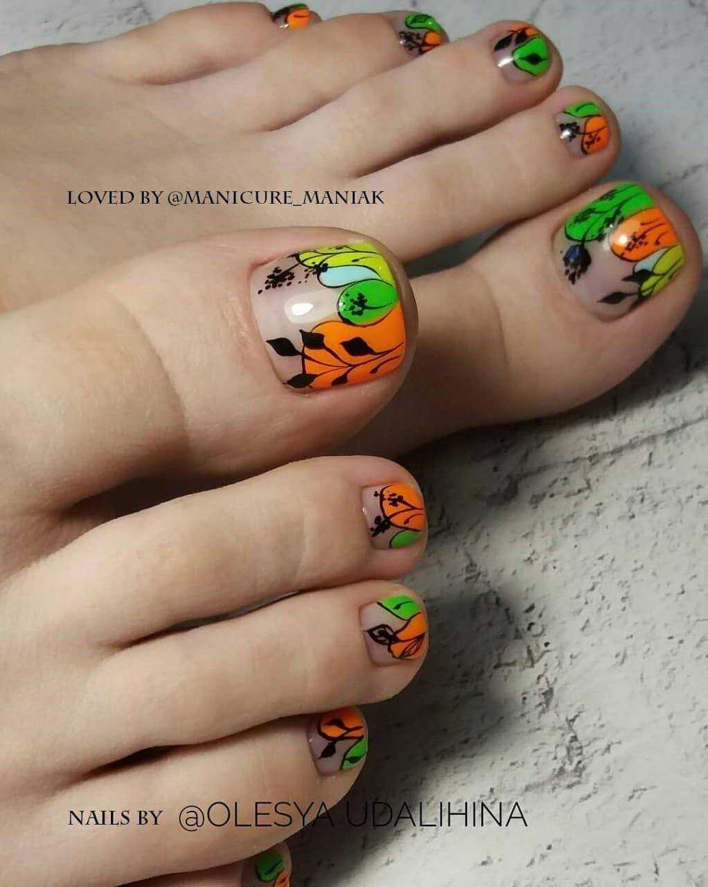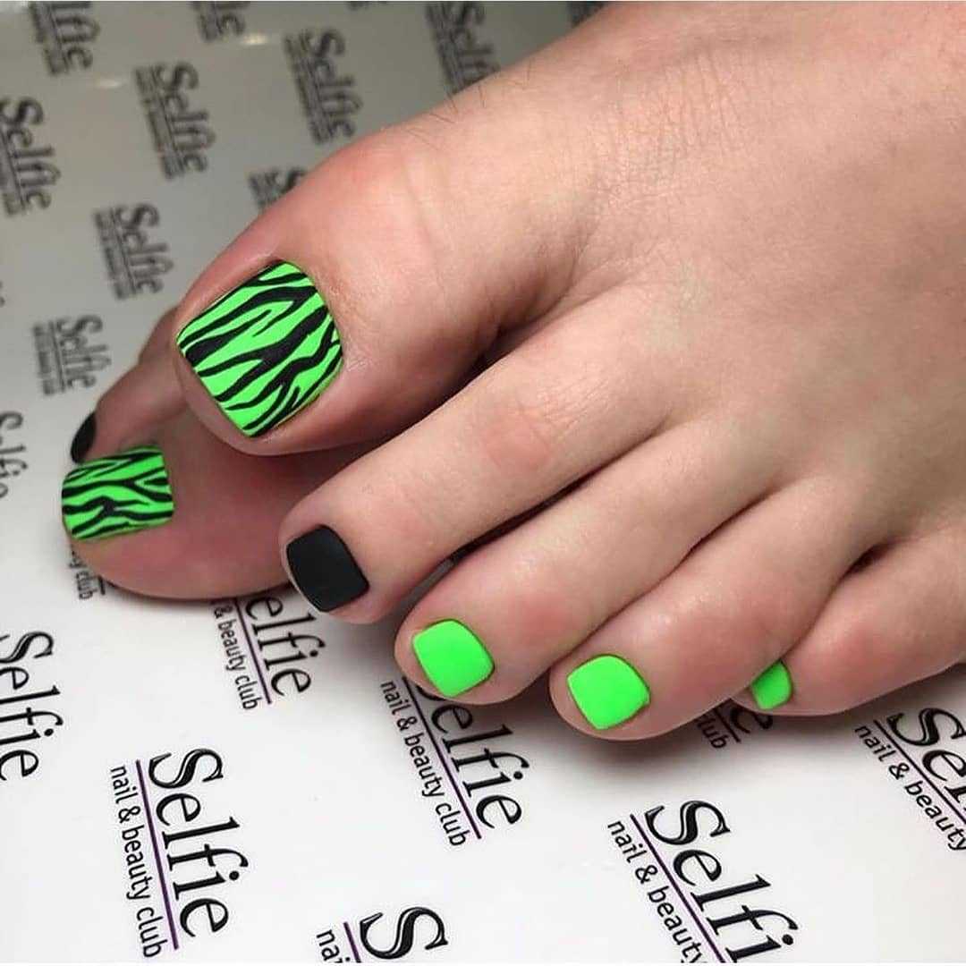 Модный неоновый педикюр может быть выполнен в одном цвете или плавных переходов омбре. Не менее круто смотрятся с такой палитрой тёмные контрастные рисунки, например, графические изображения из нескольких тонких штрихов или сложных композиции из геометрических мотивов. А также педикюр с неоновыми красками в стиле френч, дизайн в анималистическом стиле, имитирующий кожу рептилий или леопардовый окрас и многочисленные вариации оформления с разными видами декора.