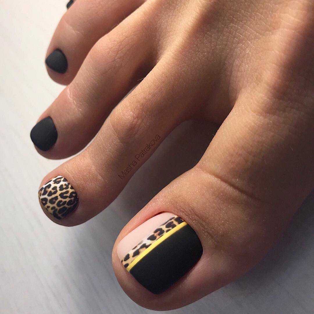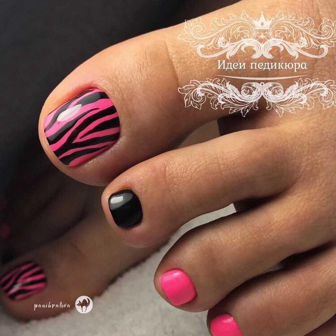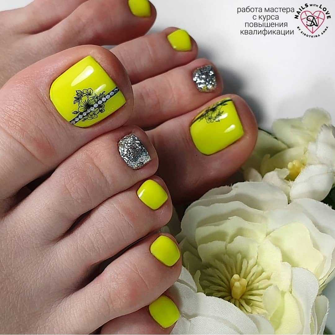 Модный неоновый педикюр может быть выполнен в одном цвете или плавных переходов омбре. Не менее круто смотрятся с такой палитрой тёмные контрастные рисунки, например, графические изображения из нескольких тонких штрихов или сложных композиции из геометрических мотивов. А также педикюр с неоновыми красками в стиле френч, дизайн в анималистическом стиле, имитирующий кожу рептилий или леопардовый окрас и многочисленные вариации оформления с разными видами декора.
