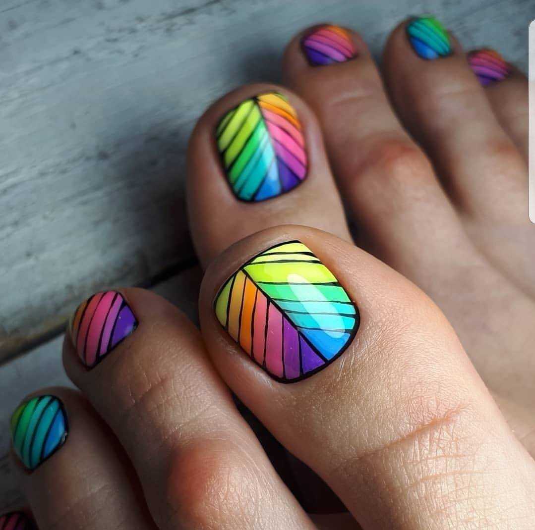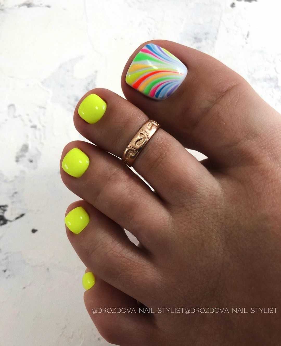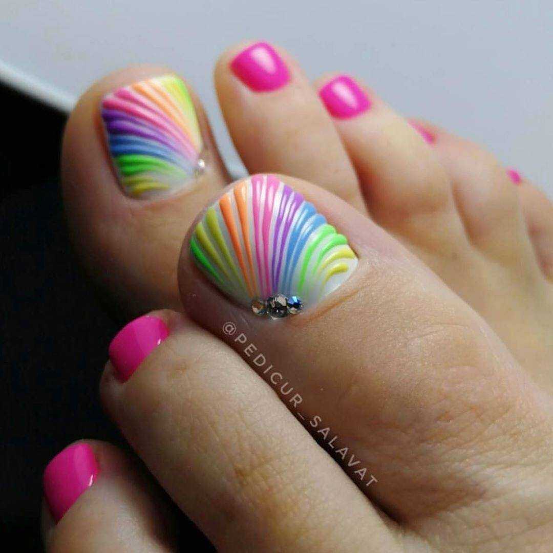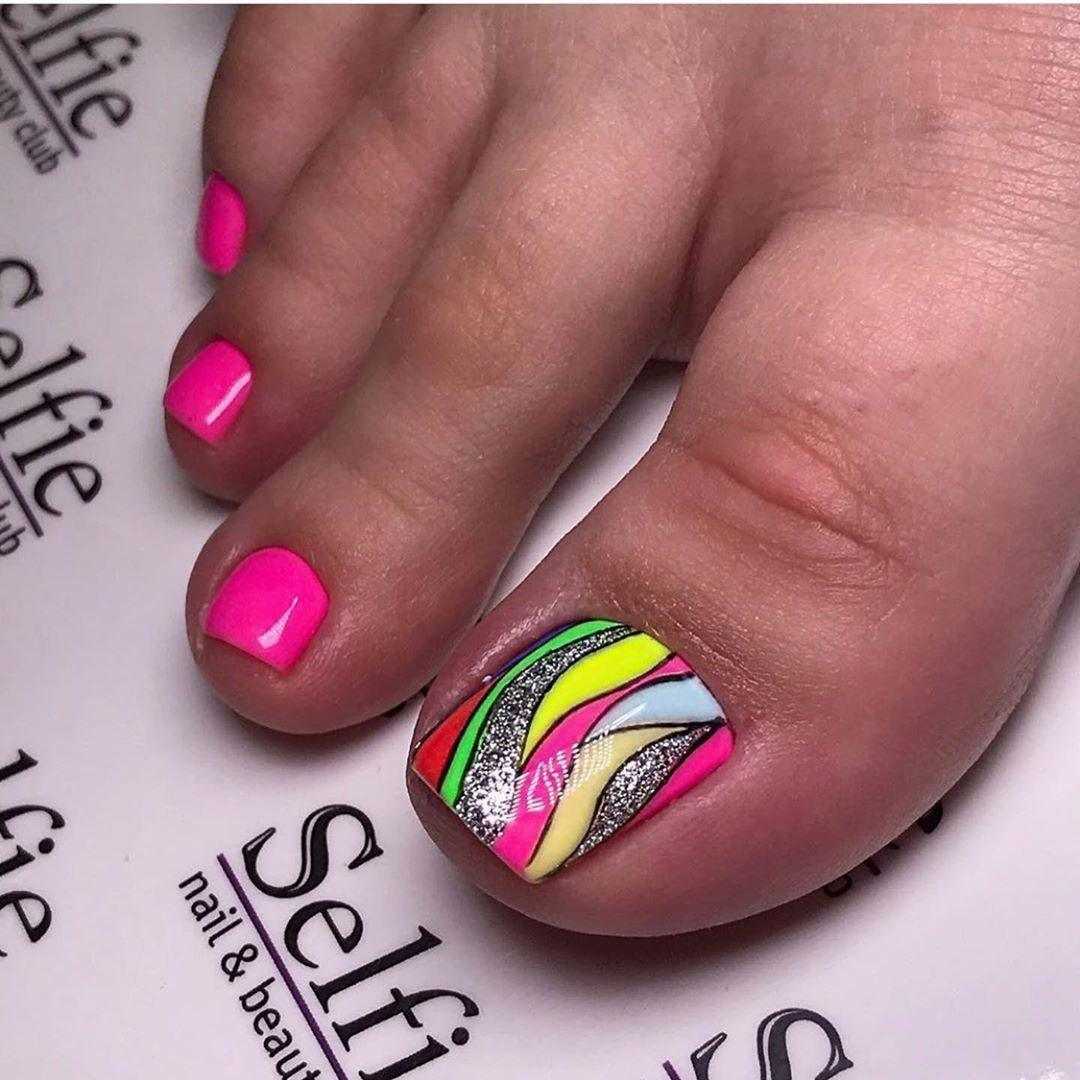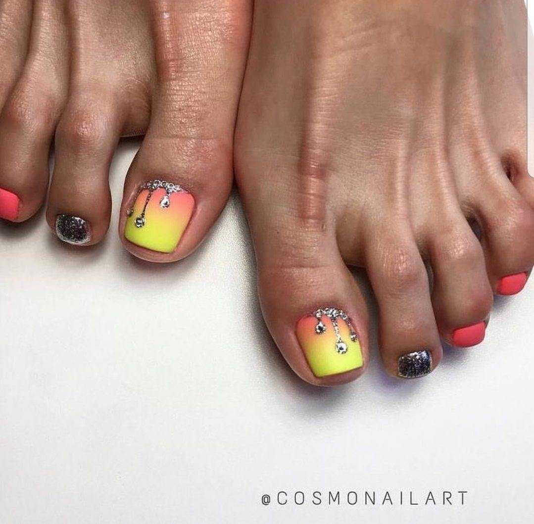 Новомодный педикюр, выполненный в ярких неоновых оттенках более актуально назвать в этом сезоне мега взрывом цвета