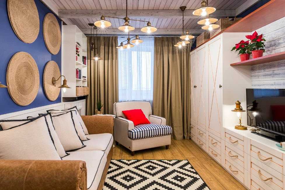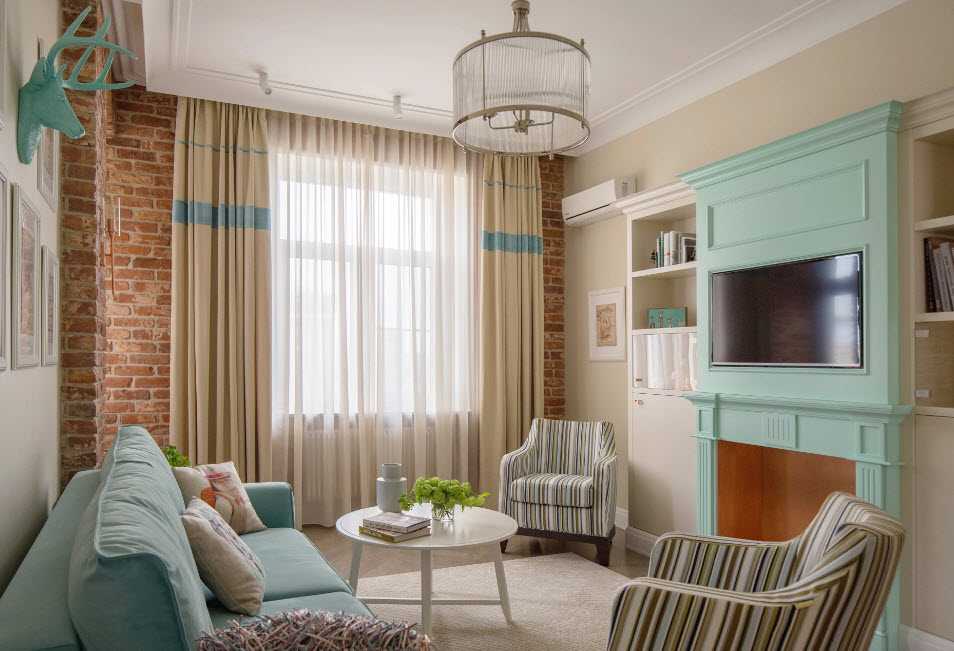 - Небольшое помещение с низкими потолками – торшеры и лампы, расположенные в углах комнаты, от центральной люстры лучше отказаться, ведь она сделает потолки еще ниже, в результате чего они будут давить на находящихся в гостиной людей.