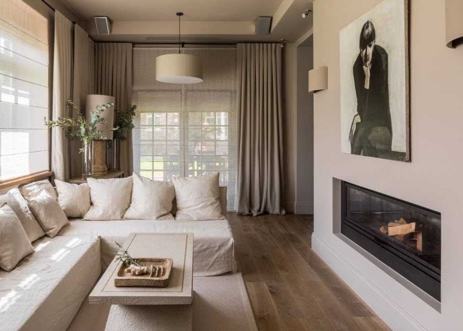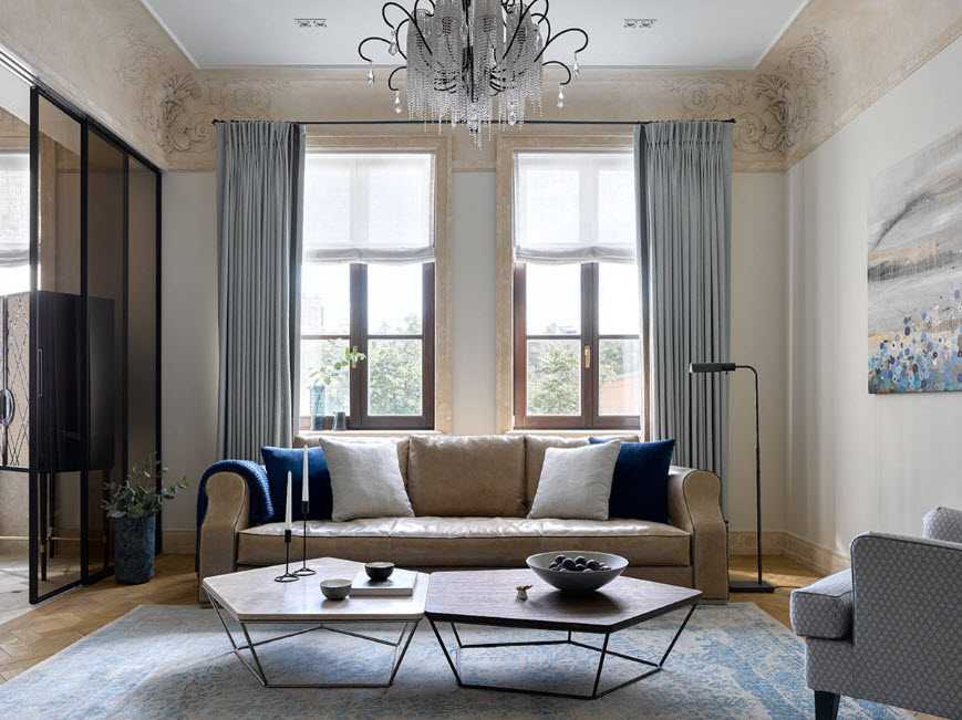 В тех интерьерах, где два уровня окон расположены близко друг другу, часто принимают решение об их объединении одним ансамблем штор с возможностью автоматического управление ими. Связано это с тем, что подвинуть такие шторы вручную довольно сложно.