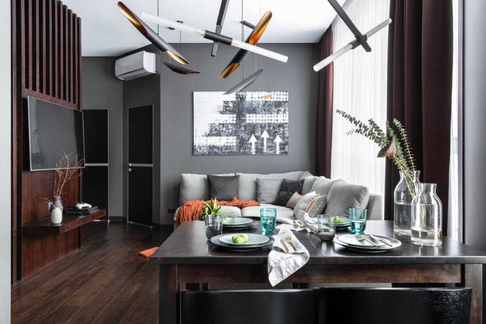 Плохо влияет на восприятие интерьера кухни-гостиной как недостаток, так и обилие светильников. Много ламп дробят пространство, создавая эффект нагромождённой обстановки.