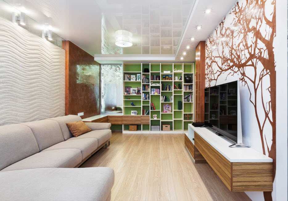 Когда гостиная одновременно выполняет несколько функций, то создание многоуровневого освещения необходимо. Для каждого места необходимо предусмотреть свой прибор освещения. Около дивана можно установить бра или торшер, рядом с акрами — точечные светильники. Создание многоуровневых потолков позволит осветить отдельные зоны.