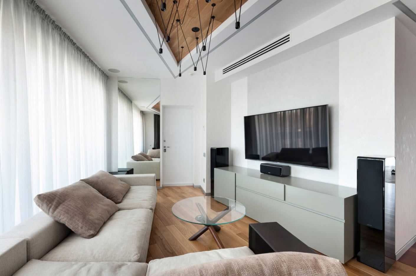 В большинстве примеров прямоугольной гостиной расположение двери напротив окна является стандартным, что визуально вытягивает и без того узкую комнату. Чтобы избавиться от «вагонного» эффекта дизайнеры советуют прибегнуть к небольшим хитростям и увеличить размер дверного проёма или вообще заменить его аркой. Также помогут решить эту проблему вертикальные рисунки или глянец на широких стенах.