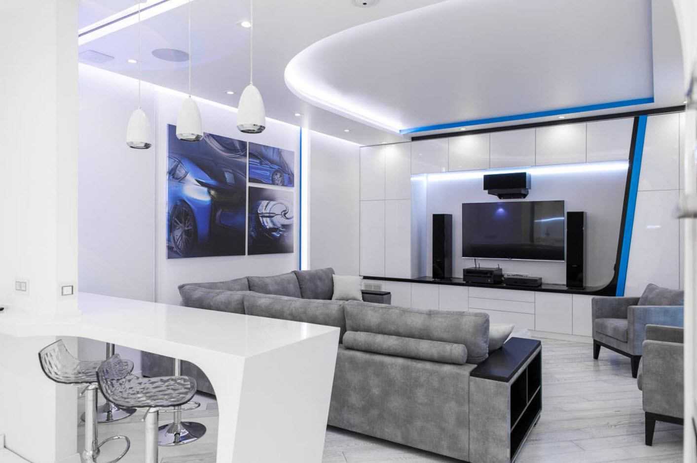 | эклектика, авангард, футуристика | белый, лимонный, синий, фуксийный, золотистый; чем насыщеннее цвет, тем меньше его в композиции | натяжные потолки, возможно, с блестящей поверхностью, ламинат, керамогранит, обои разных, но родственных оттенков | предметы мебели оригинальной формы, встроенные подсветки |