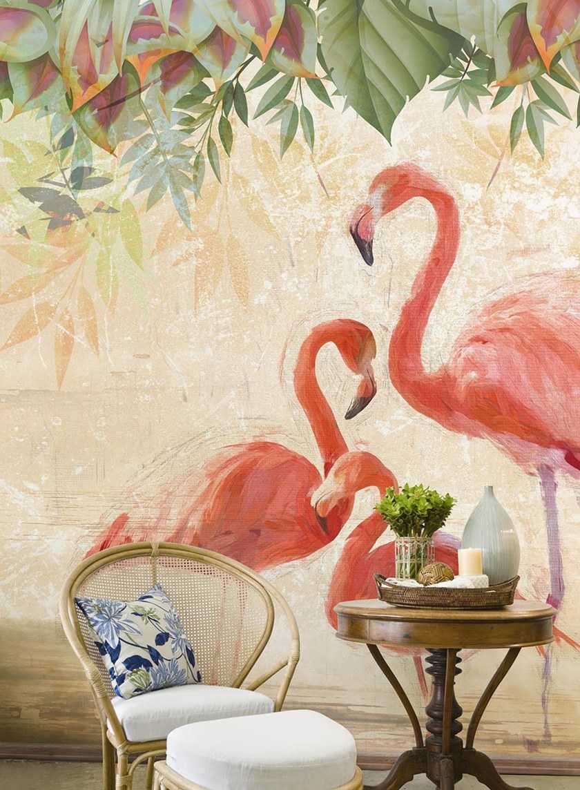 Розовые стены — отличная идея не только в комнате маленькой принцессы. Этот цвет будет хорошо сочетаться с ярким, приглушенным скандинавским стилем, а также с гламурными дополнениями, в пастельной версии стиля ретро. Смелые люди будут сочетать розовый с темно-зеленым или синим цветом и приправлять, например, золотыми аксессуарами. Выбирайте розовые обои фламинго — это настоящий хит в последнее время.