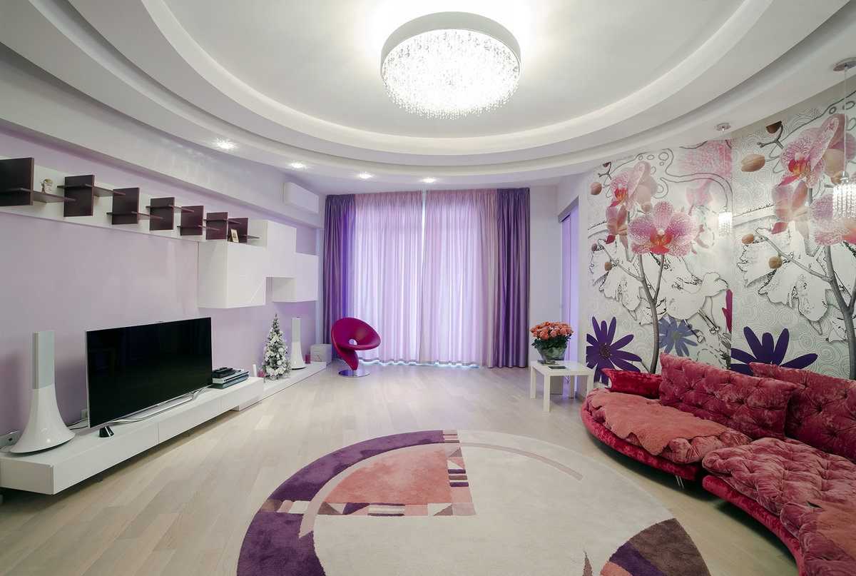Зал в стиле прованс характеризуется нежными пастельными оттенками и обилием белой палитры. Белоснежные оттенки гармонично сочетаются с лавандовыми, бледно-желтыми, голубыми, мятными и розовыми тонами. Французская стилистика отличается наличием элегантной мебели на изящных ножках, плетеными элементами, ажурными кружевами, композициями из цветов и комнатными горшечными растениями.