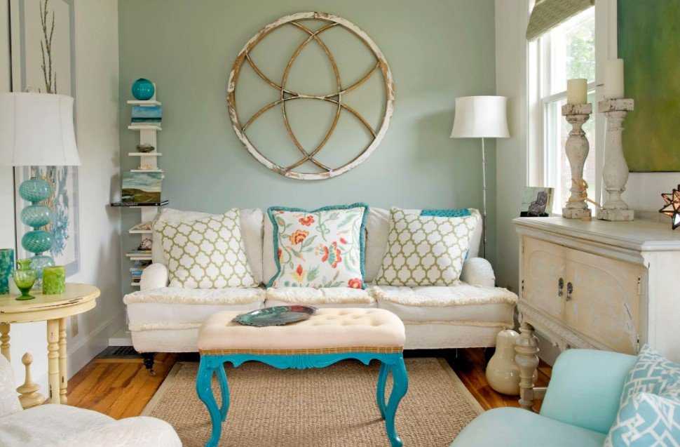 Средиземноморское направление благоволит к светлым зелёным тонам и оттенку морской волны. Гостиная комната в восточном стиле будет очень гармонично смотреться с нефритовым или оливковым зелёным.