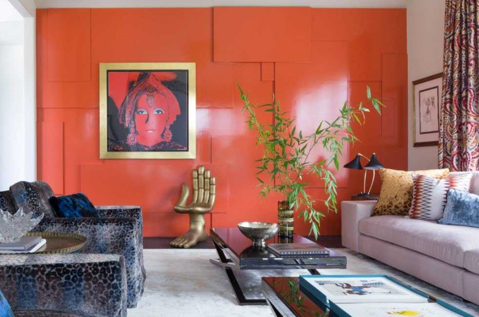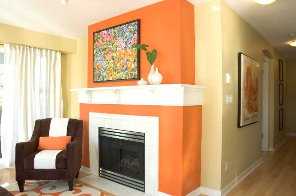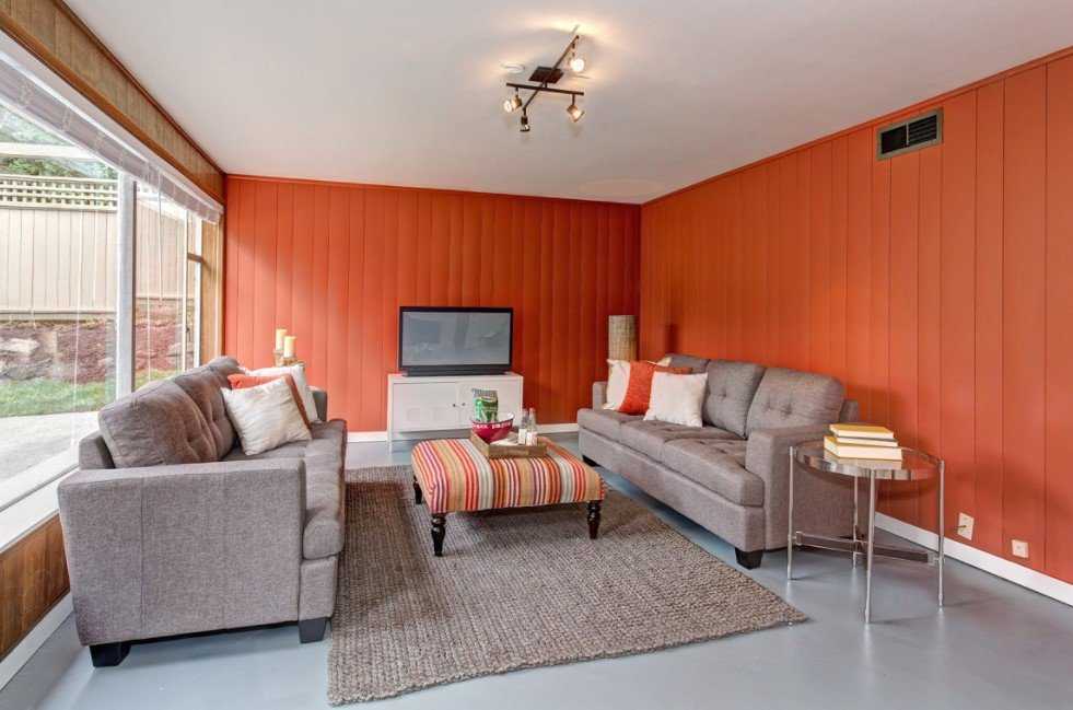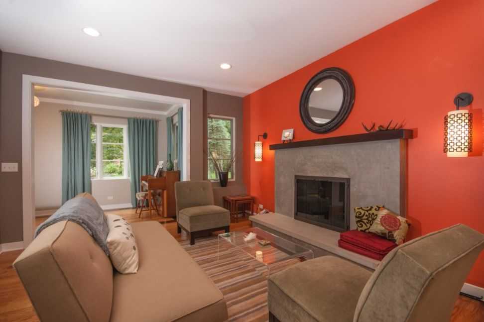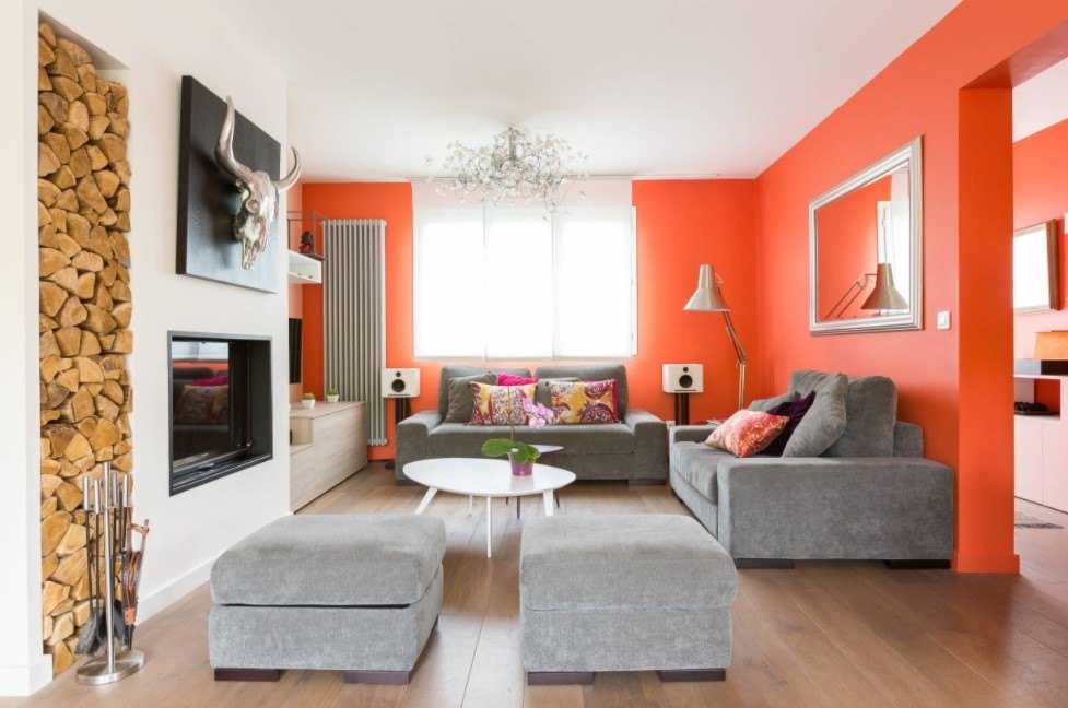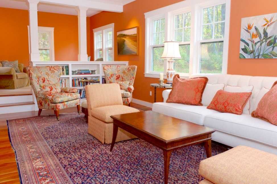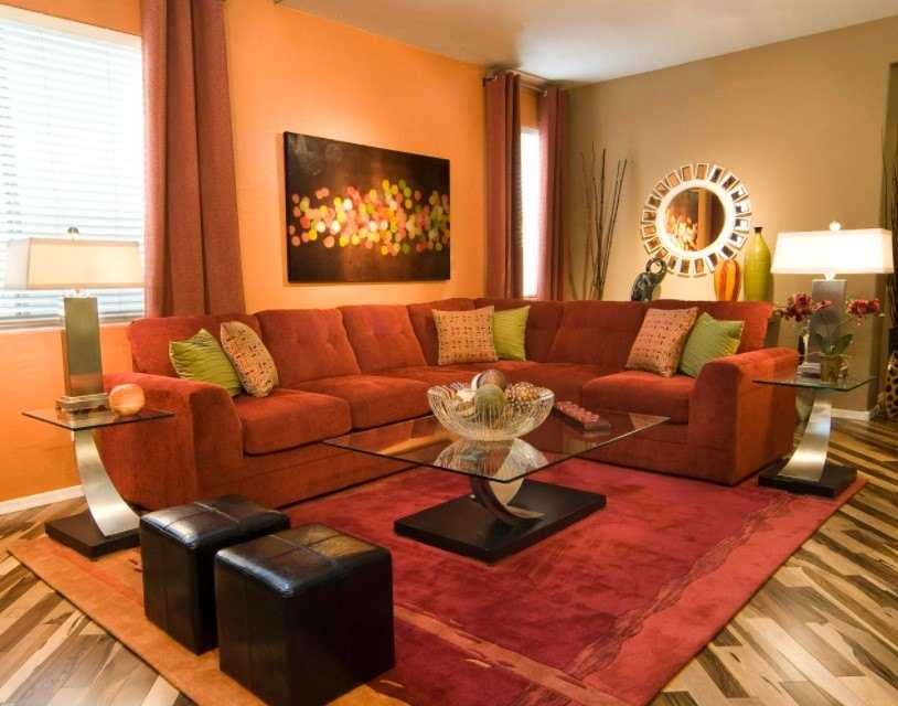 Такой вариант цветового сочетания больше остальных привносит в интерьер уют и тепло. Оранжевый цвет прекрасно сочетается со светлым деревом, поэтому в таком дизайне минимум шансов переборщить и сделать комнату аляповатой. Такое сочетание вписывается во многие стили, а также хорошо в таком интерьере выглядит акцентный мебельный гарнитур со светло-бежевыми стенами.