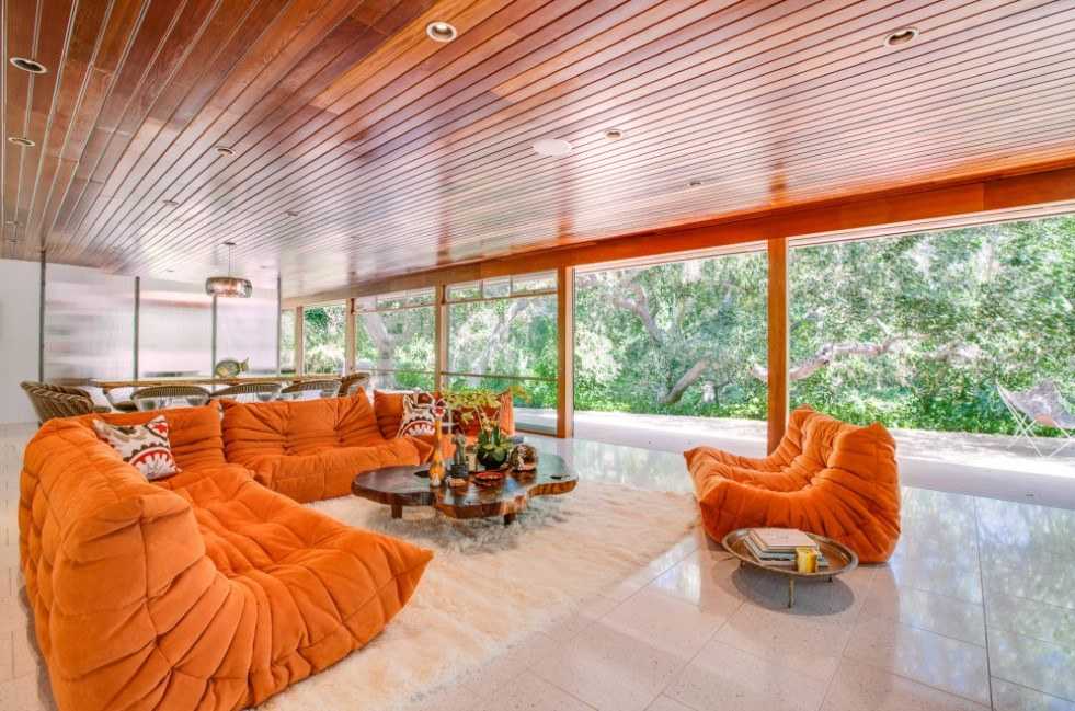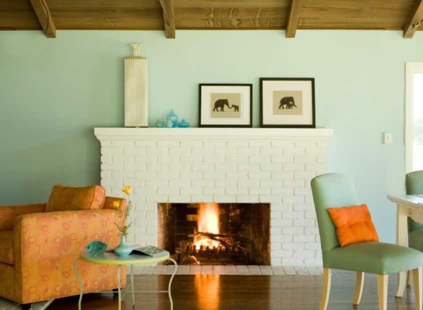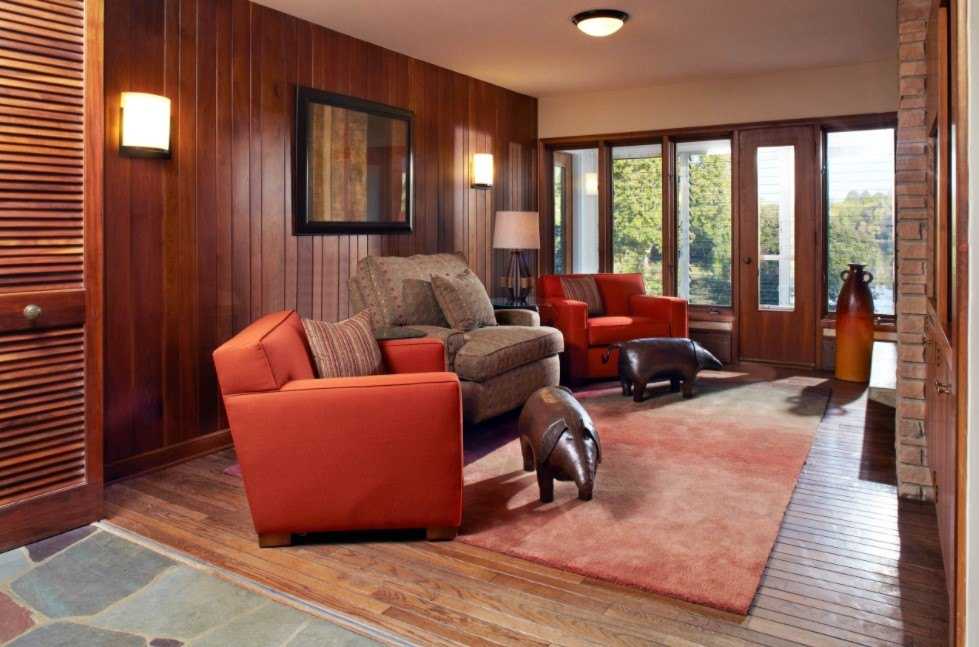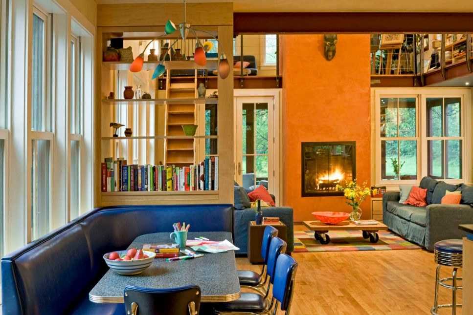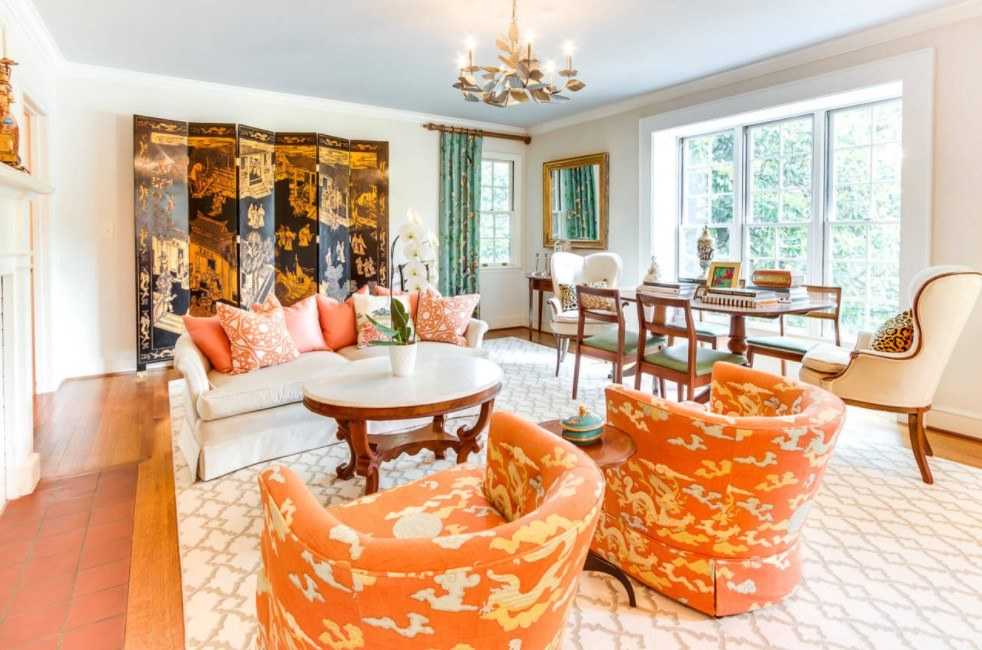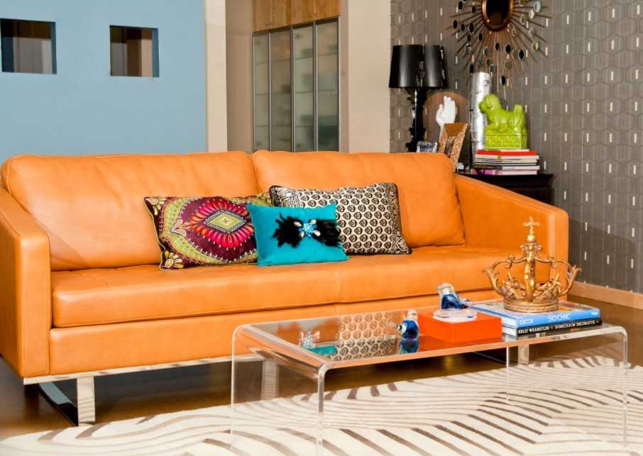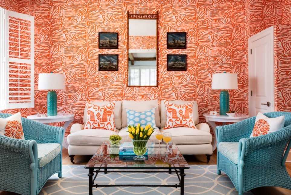Такой вариант цветового сочетания больше остальных привносит в интерьер уют и тепло. Оранжевый цвет прекрасно сочетается со светлым деревом, поэтому в таком дизайне минимум шансов переборщить и сделать комнату аляповатой. Такое сочетание вписывается во многие стили, а также хорошо в таком интерьере выглядит акцентный мебельный гарнитур со светло-бежевыми стенами.