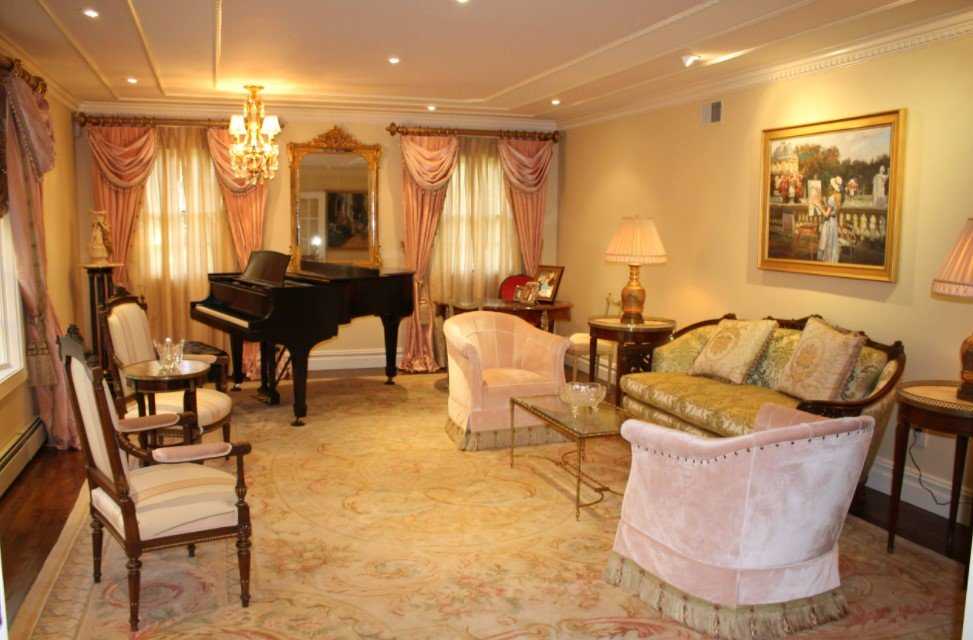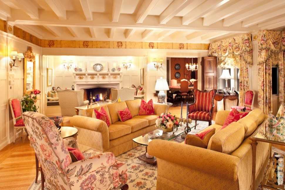 Чтобы внести легкость в насыщенную цветами обстановку, можно использовать зеркала, люстры из хрусталя, шторы из стекляруса.