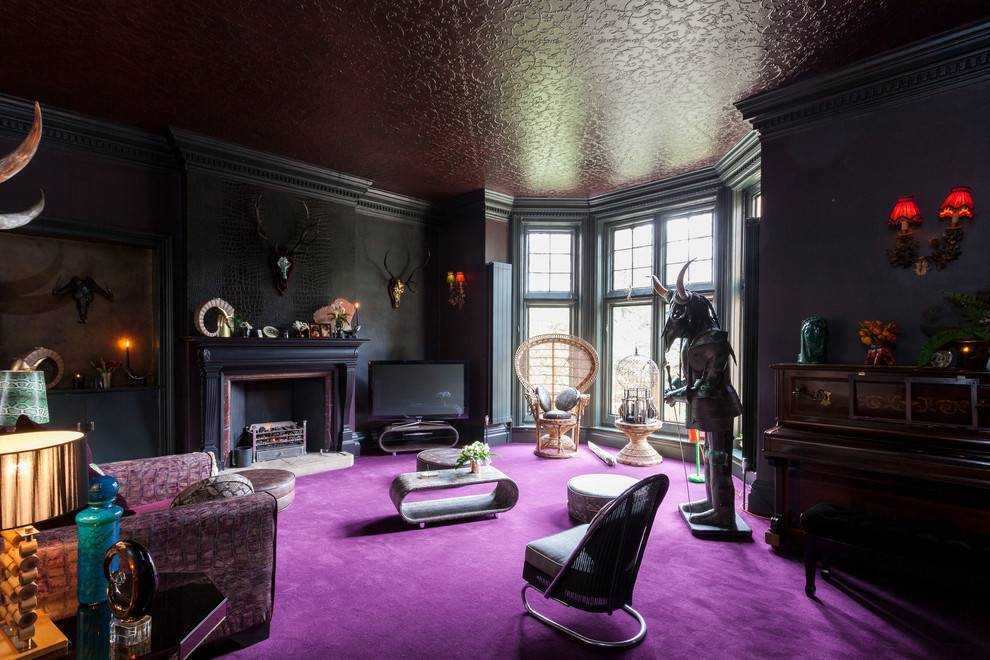 Цветовая палитра здесь обширно представлена темными оттенками. Используйте черные, фиолетовые, бордовые тона. К примеру, напольное покрытие выполняется фиолетовым ковролином. Матовая фактура здесь будет уместна. Стены при этом окрашиваются черным. Чтобы разнообразить однотонность стенового пространства, его можно местами оформить декоративной штукатуркой или необычными рельефами.