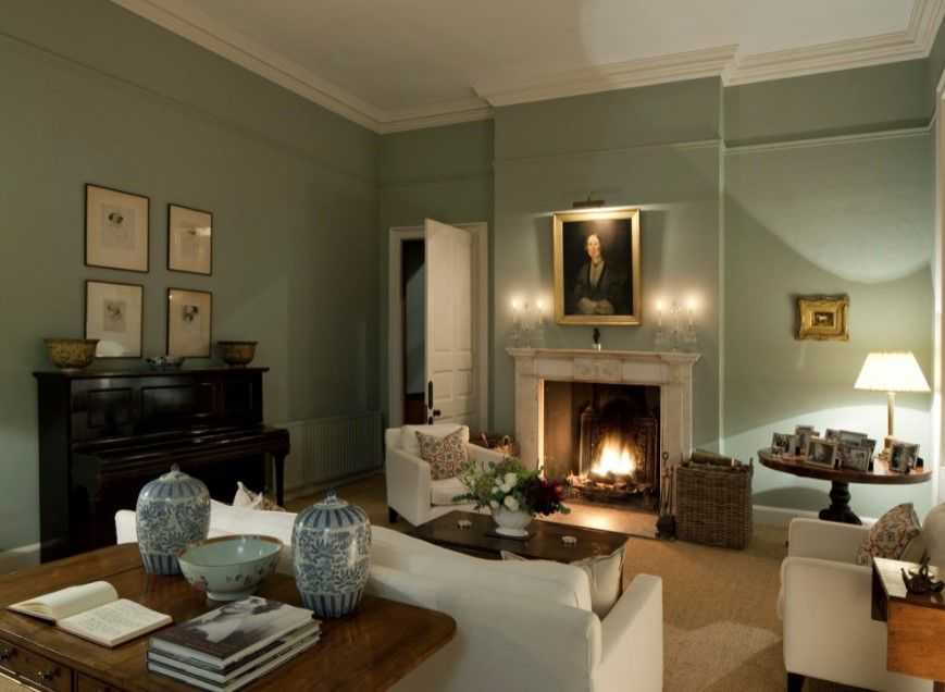 Приглушенный оттенок зелени или мята в компании с белым или бежевым актуальны для «деревенского» и романтичного прованса. Для оформления кантри в этом случае используются коричневый. Различные комбинации кофейного и серого оттенка в тандеме с тёмными зелёными тонами характерны для оформления гостиной в английском стиле.