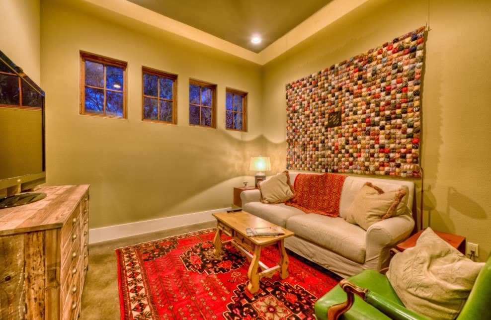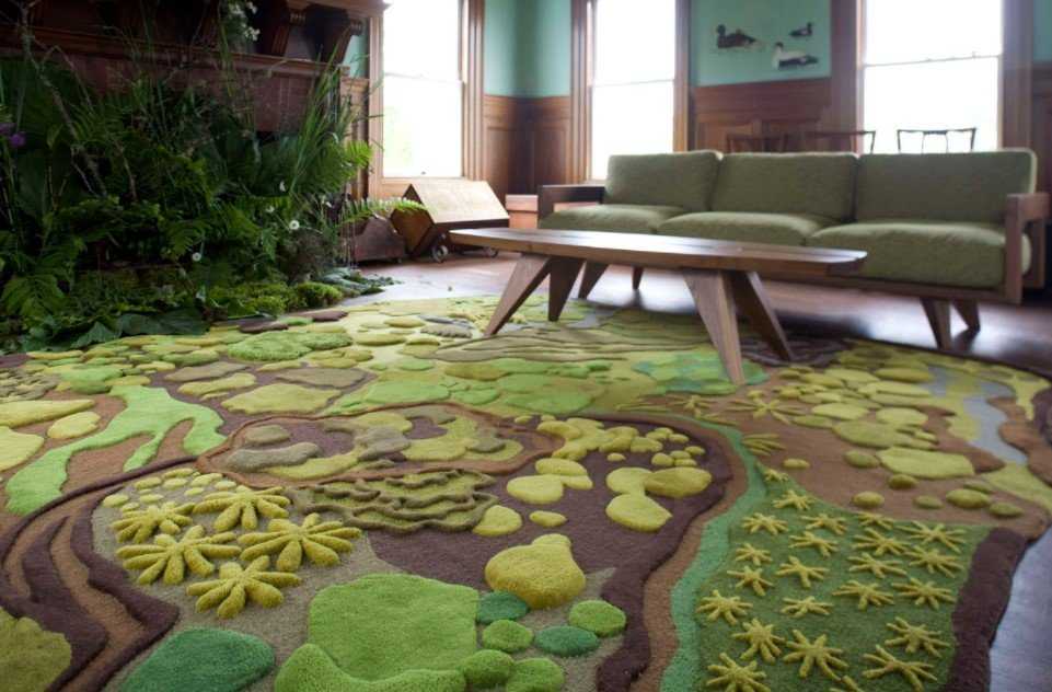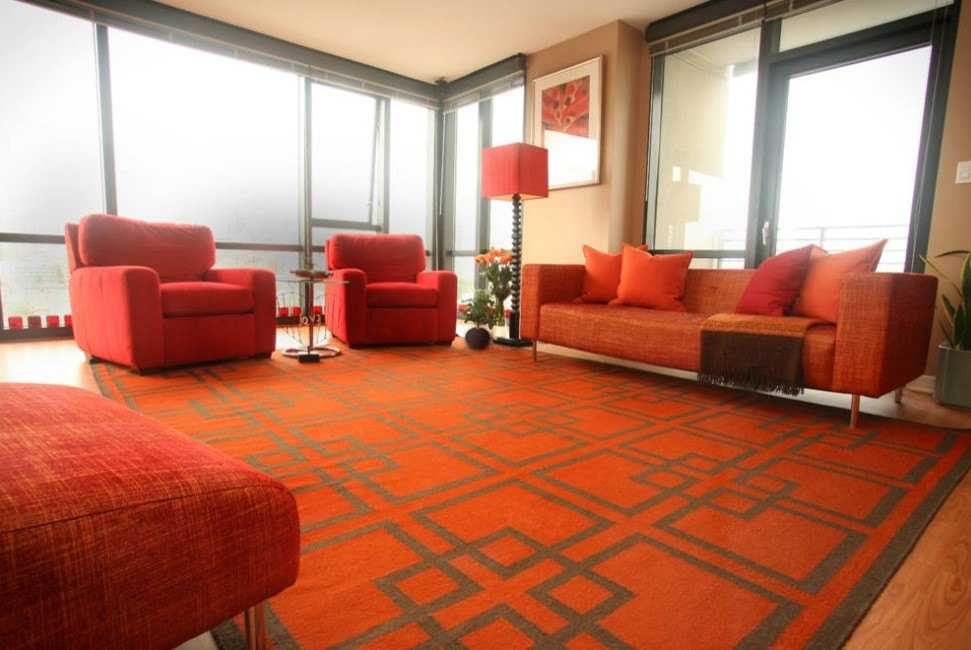 - Под цветовые пятна. Если в комнате уже есть цветовые акценты, то с ними можно связать и тон ковра. Например, к оранжевому торшеру и панно подобрать апельсиновый коврик. А в общей обстановке при этом будет преобладать лавандовый цвет.