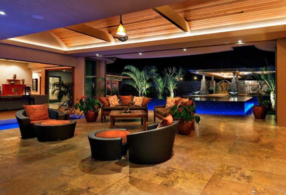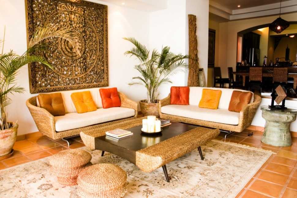 Этно. Лучше всего для этнического стиля подходят настольные лампы и торшеры из ротанга, кованые потолочные светильники, лампы с мозаикой в турецком стиле, резные лампы–факелы.
