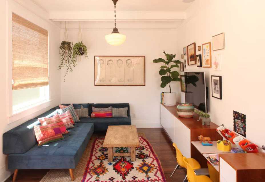 - Контраст. Ковер заметно выделяется на общем фоне. Особо актуален такой вариант, если гостиную нужно разделить цветом на зоны. Часто такая необходимость возникает в однокомнатных квартирах или студиях.