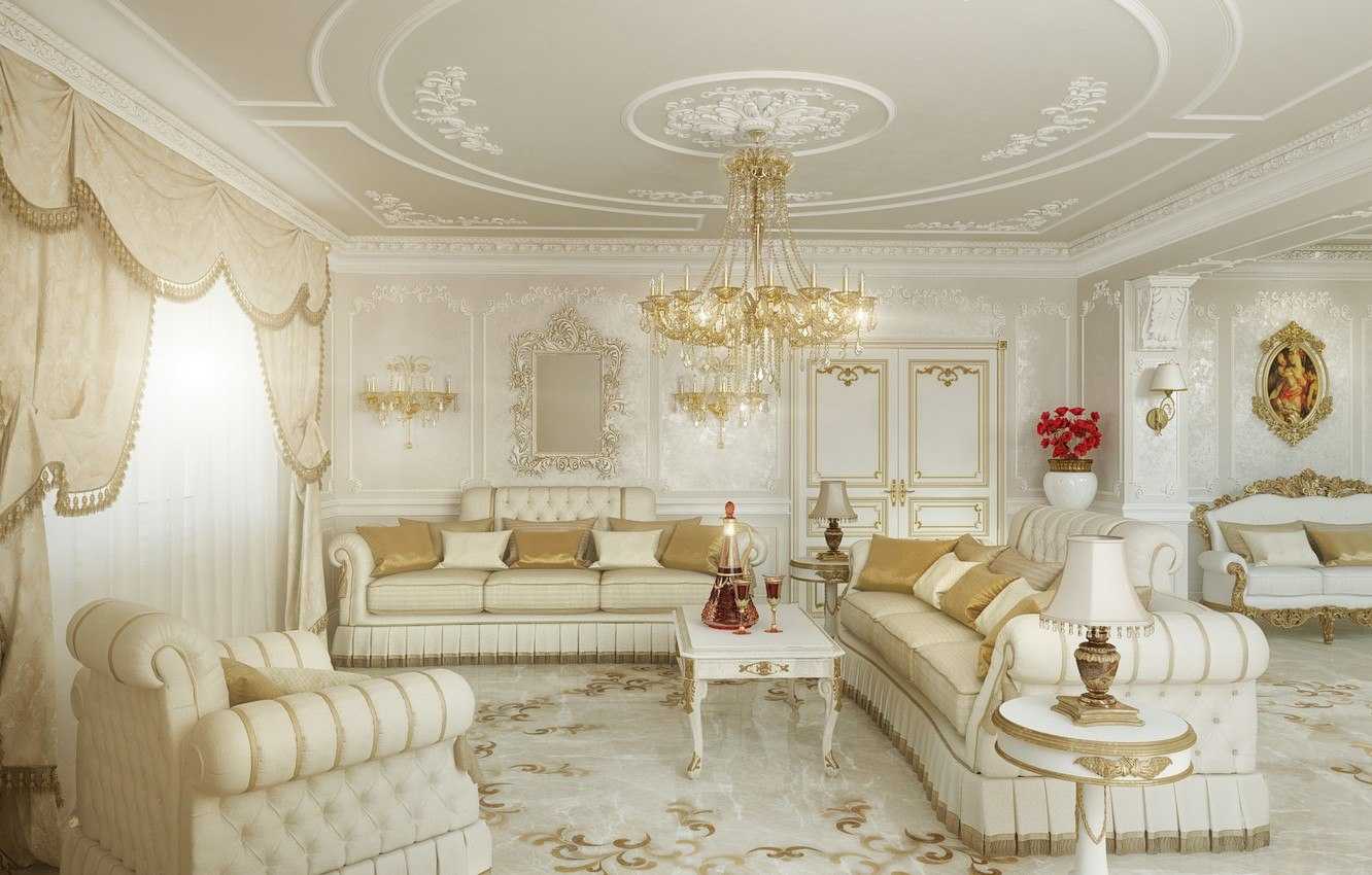 Для обустройства золотой гостиной в классическом стиле актуальным предложением станет белоснежный диван с креслами или софа с резными вставками и изящными ножками в золотистом дизайне. Чёрная мебель будет оригинально смотреться в бело-золотой гостиной, выполненной в стиле неоклассика.
