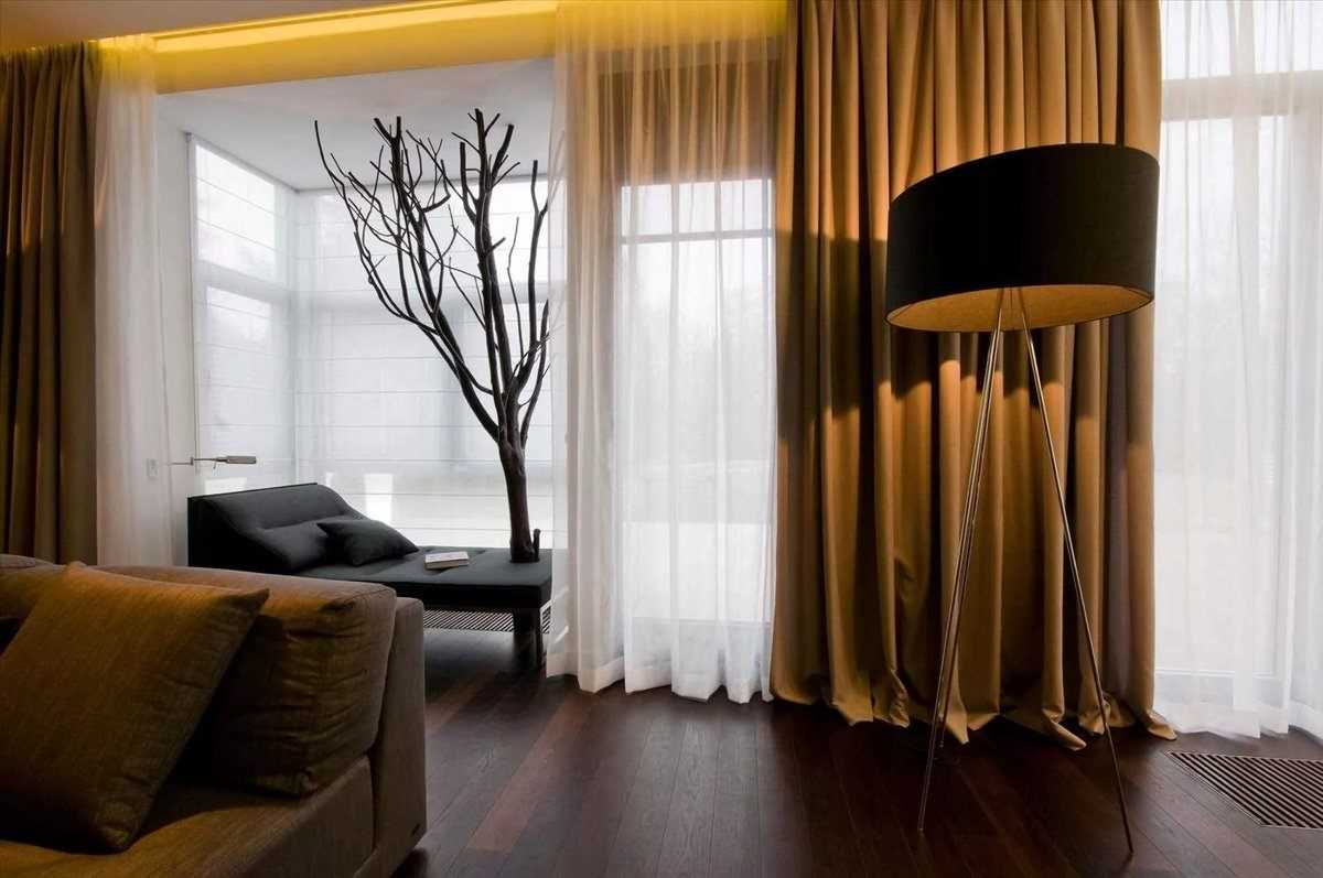 В гостиную стоит подобрать комплект современных штор с тюлем. Если зал просторный, имеет смысл «поиграть» с контрастными оттенками, либо затемнить зону окна шторами в тон обивки мягкой мебели или диванным подушкам, а также другим элементам интерьера.