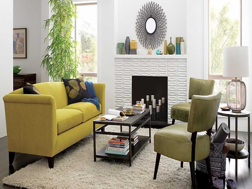 Желтая мебель и ковер на фоне белых стен в интерьереИсточник abik55.ru