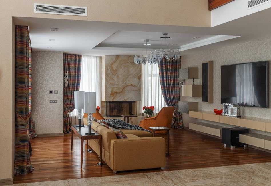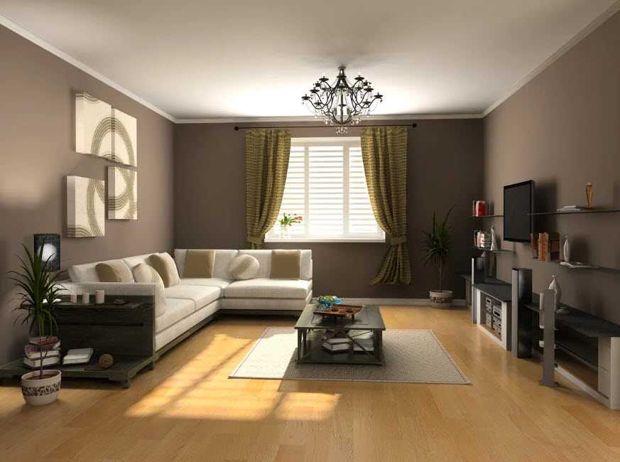 Гостиная, оформленная в бежево-коричневых тонах, уже давно стала классикой, поскольку заявленный цвет может быть как теплым кремово-бежевым, так и персиковым, цвета слоновой кости и даже ореховым и цвета какао.