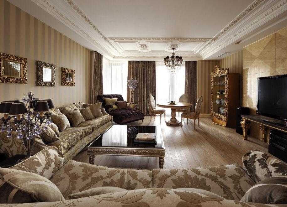 Зал в классическом стиле отличается не только неподвластным времени дизайном, но и использованием высококачественных материалов. Используйте деревянный паркет на полу, который является прочным, а также обеспечивает хорошую звукоизоляцию